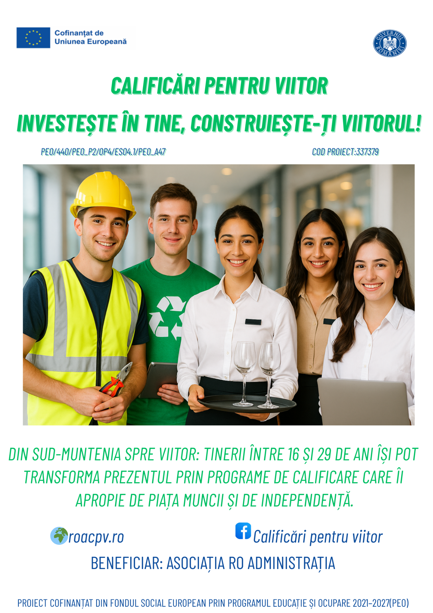 Proiect cofinanțat din Fondul Social European Plus (FSE+) prin Programul Educație și Ocupare 2021–2027, dedicat tinerilor din regiunea Sud-Muntenia. Oferim formare profesională, consiliere, orientare și mediere pe piața muncii pentru a crește șansele reale de angajare.